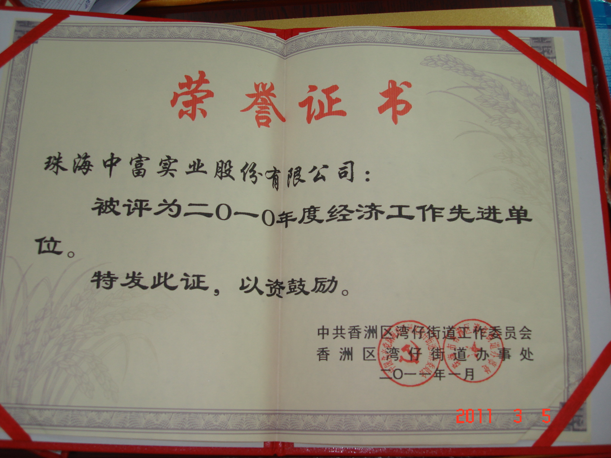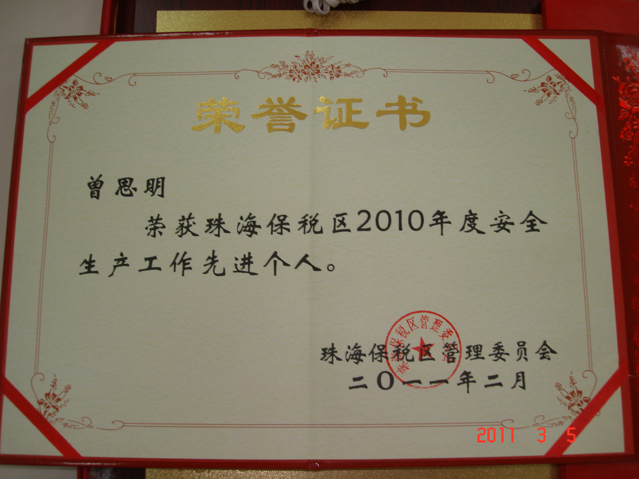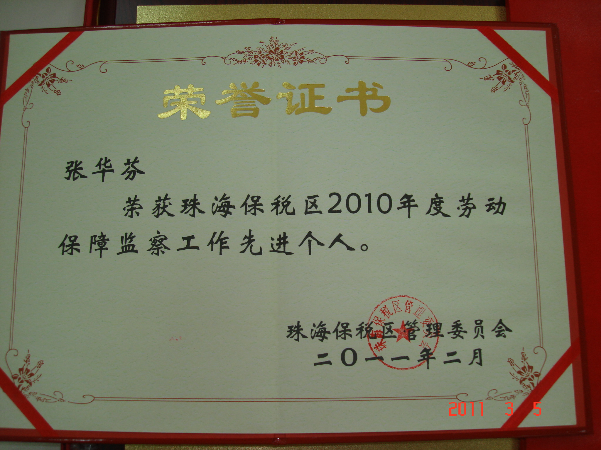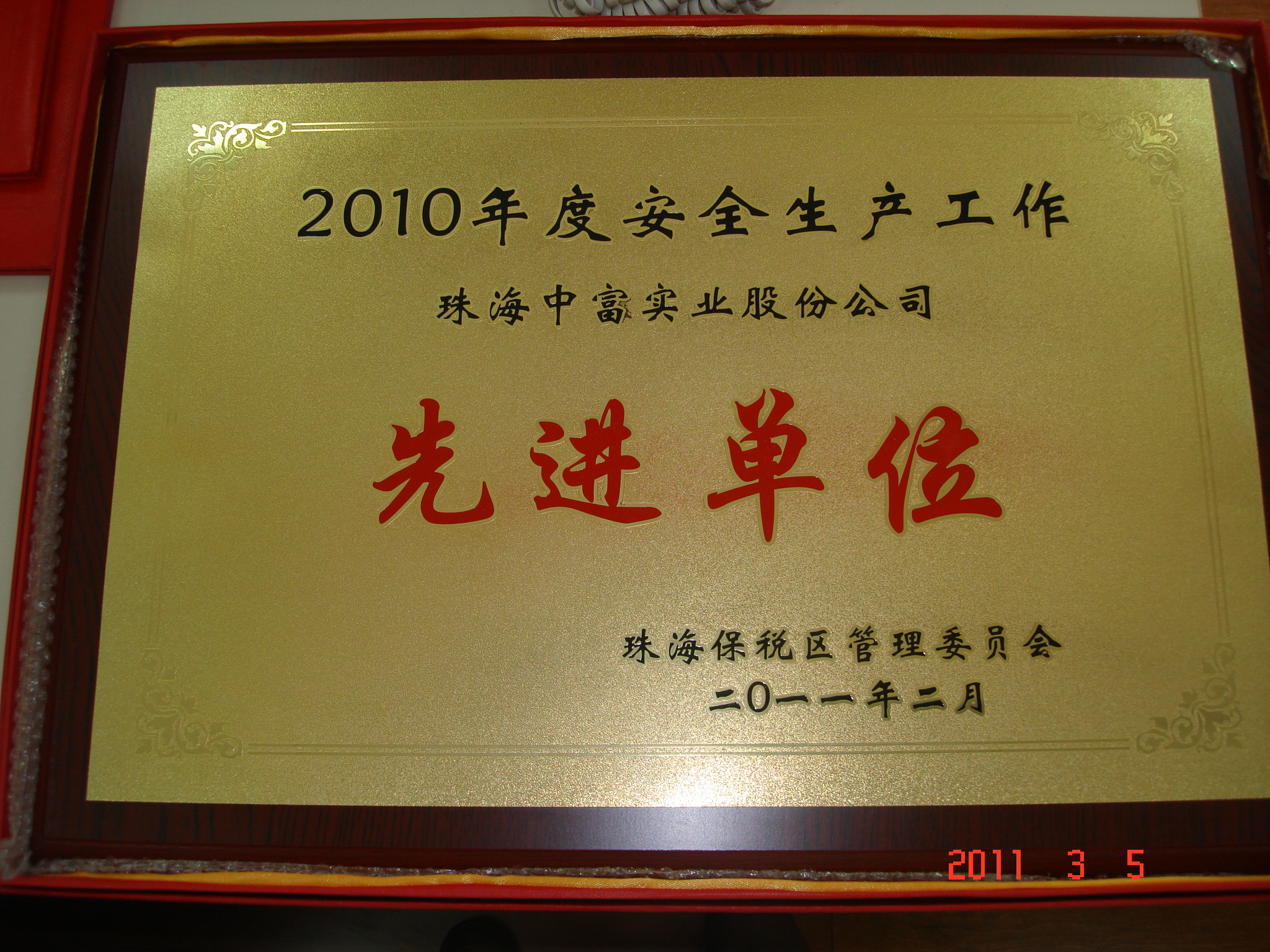 2011年剛邁入新的起點(diǎn),珠海中富喜訊不斷傳來,先后被評為“2010年度經(jīng)濟(jì)工作先進(jìn)單位”和“2010年度安全生產(chǎn)工作先進(jìn)單位”。支持中心人事部的曾思明和張華芬同志也分別榮獲“珠海保稅區(qū)2010年度安全生產(chǎn)工作先進(jìn)個(gè)人”和“珠海保稅區(qū)2010年度勞動(dòng)保障監(jiān)察工作先進(jìn)個(gè)人”。
