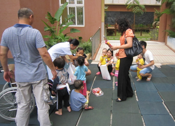 隨后,黃老師帶我們參觀了陽光幼兒園。小朋友正好在上戶外活動課,運動場上大概有10多個孩子,他們有的在玩蕩秋千,有的玩滑梯,有的在玩游戲,顯得十分開心……旁邊有一位男老師和女老師還有一位保育員在陪護,還有一位大伯,是一名熱心的義工,在看護一位坐在輪椅上的腦癱兒童。孩子們看到我們來了,十分開心也很懂禮貌,紛紛叫道:“阿姨好!”我們也把手上帶來的糖果、餅干等分發(fā)給他們??吹竭@些孩子們,我們的問題一下多了起來,黃老師一一為我們做了解答,她介紹:“這些孩子有的是嚴重的地中海貧血癥、有的是先天性心臟病、有的是唐氏綜合癥,他們從小被父母遺棄,由福利院撫養(yǎng)長大。目前,幼兒園最小的孩子才10多天大,所以保育員們都需要24小時值班,晚上起來為孩子們沖奶粉、換尿布。醫(yī)院也配置了醫(yī)務室,為孩子們做康復治療。幼兒園也會定期帶孩子們到戶外活動,比如10月份將組織去海濱公園……”